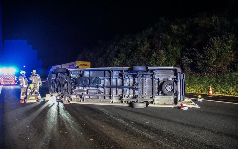 Am Freitag gegen 22.45 Uhr ereignete sich auf der A8 zwischen den Anschlussstellen Rutesheim und Leonberg-West ein Verkehrsunfall. Ein 51-jähriger Lkw-Fahrer (VW) war auf der rechten Fahrspur unterwegs. Ein bislang unbekannter Lkw überholte den VW und scherte von der mittleren auf die rechte Fahrspur so knapp ein, dass der VW-Fahrer eine Ausweichbewegung nach rechts machen musste, um einen Zusammenstoß zu vermeiden. Hierbei geriet der VW nach rechts von der Fahrbahn in den Grünstreifen. Anschließend lenkte der Fahrer den VW wieder nach links und geriet durch die Lenkbewegung ins Schleudern. Er schleuderte nach links über alle Fahrspuren, prallte gegen die Betonleitwand, wurde von dort wieder abgewiesen, kippte auf die Beifahrerseite und blieb quer zur Fahrbahn auf der mittleren Fahrspur liegen. Der unbekannte Lkw,-Lenker, der zuvor die Fahrspur gewechselt hatte, fuhr ohne anzuhalten weiter. Einen Zusammenstoß zwischen beiden Lastern gab es nicht. Durch den Aufprall wurde der Fahrer des VW leicht verletzt und musste im Krankenhaus ambulant behandelt werden. An seinem Fahrzeug entstand ein Sachschaden von 15000 Euro. Der Flurschaden und Sachschaden an der Betonleitwand konnten noch nicht beziffert werden. Vor Ort waren die Feuerwehr Rutesheim mit zwei Fahrzeugen und elf Einsatzkräften, die Feuerwehr Leonberg mit zwei Fahrzeugen und Personen, ein Notarztwagen, ein Rettungswagen sowie die Autobahnmeisterei Ludwigsburg zur Fahrbahnreinigung. Die Fahrbahn war für die Dauer der Bergung bis 3.30 Uhr auf einen Fahrstreifen verengt. Es bildete sich ein kurzer Rückstau.